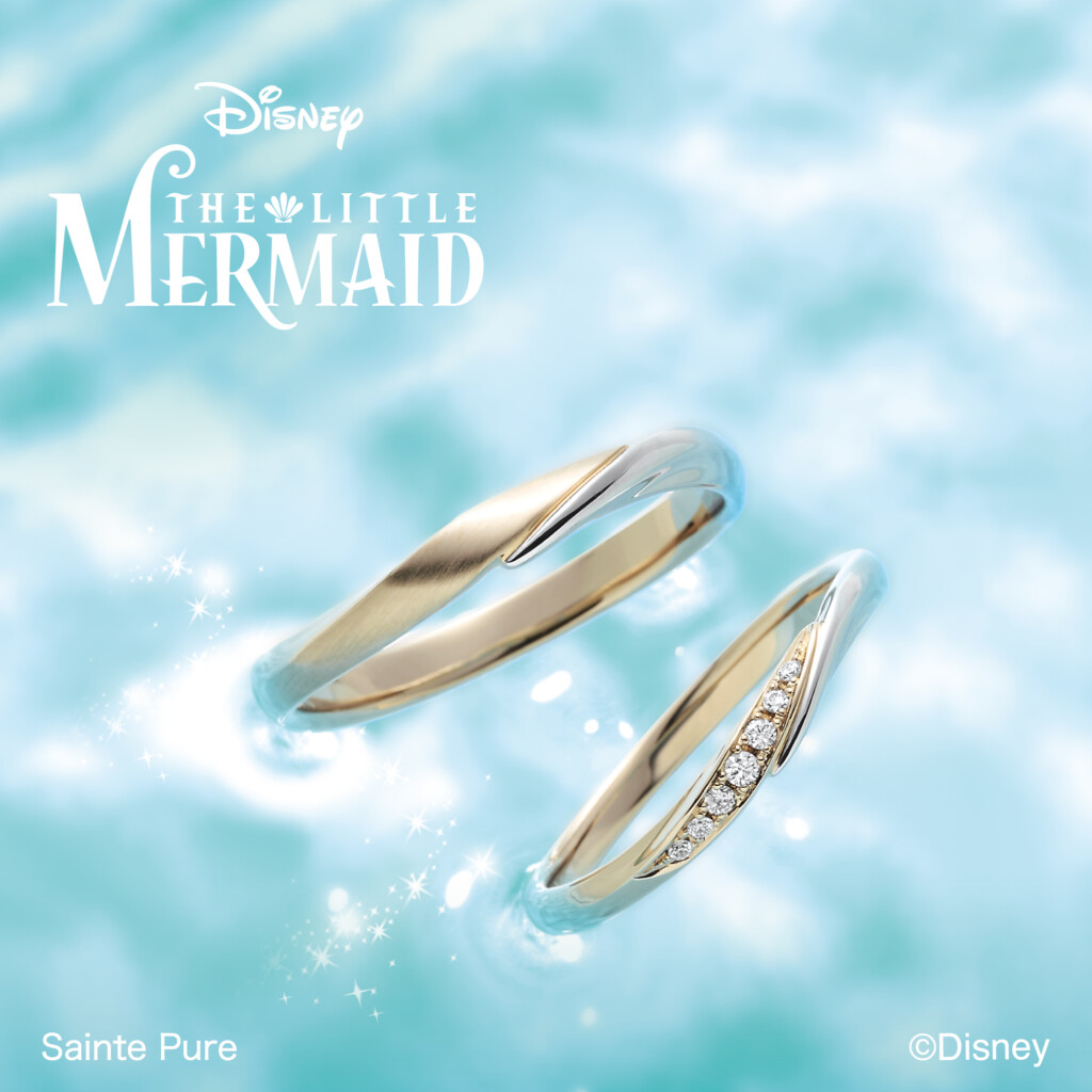海底に地上の光が差し込むようにゴールドとプラチナカラーが美しく混ざり合います。表のダイヤの流れが裏側に繋がるように石ありマリッジの内側には泳ぐアリエルの刻印が。石なしモデルは一部分にヘアライン加工を施しクールな印象に。ミラーとヘアラインのコントラストがおしゃれな仕上がり。